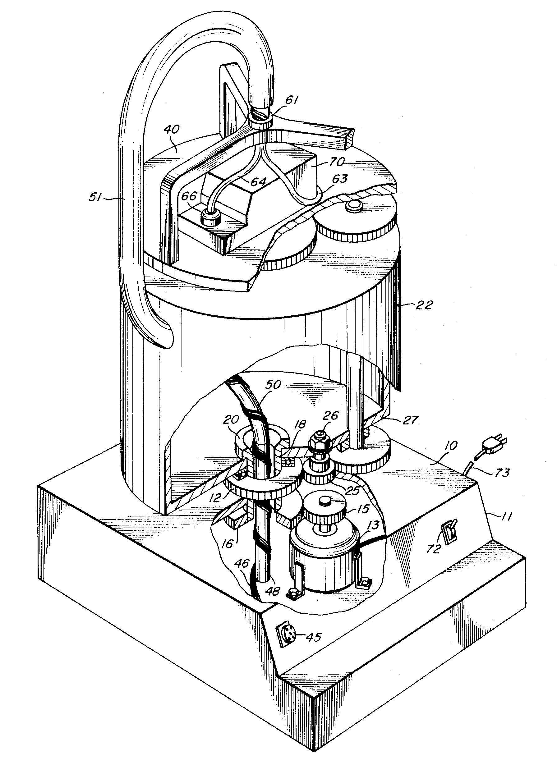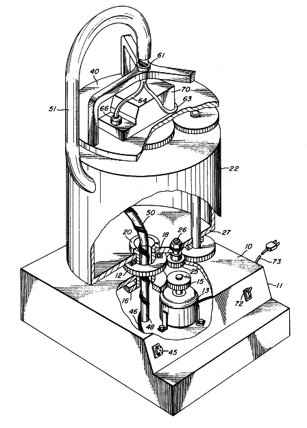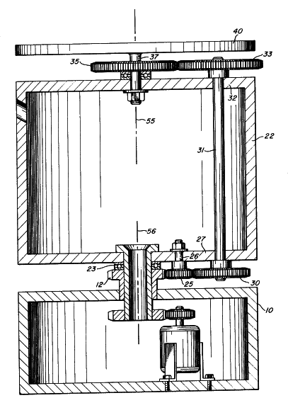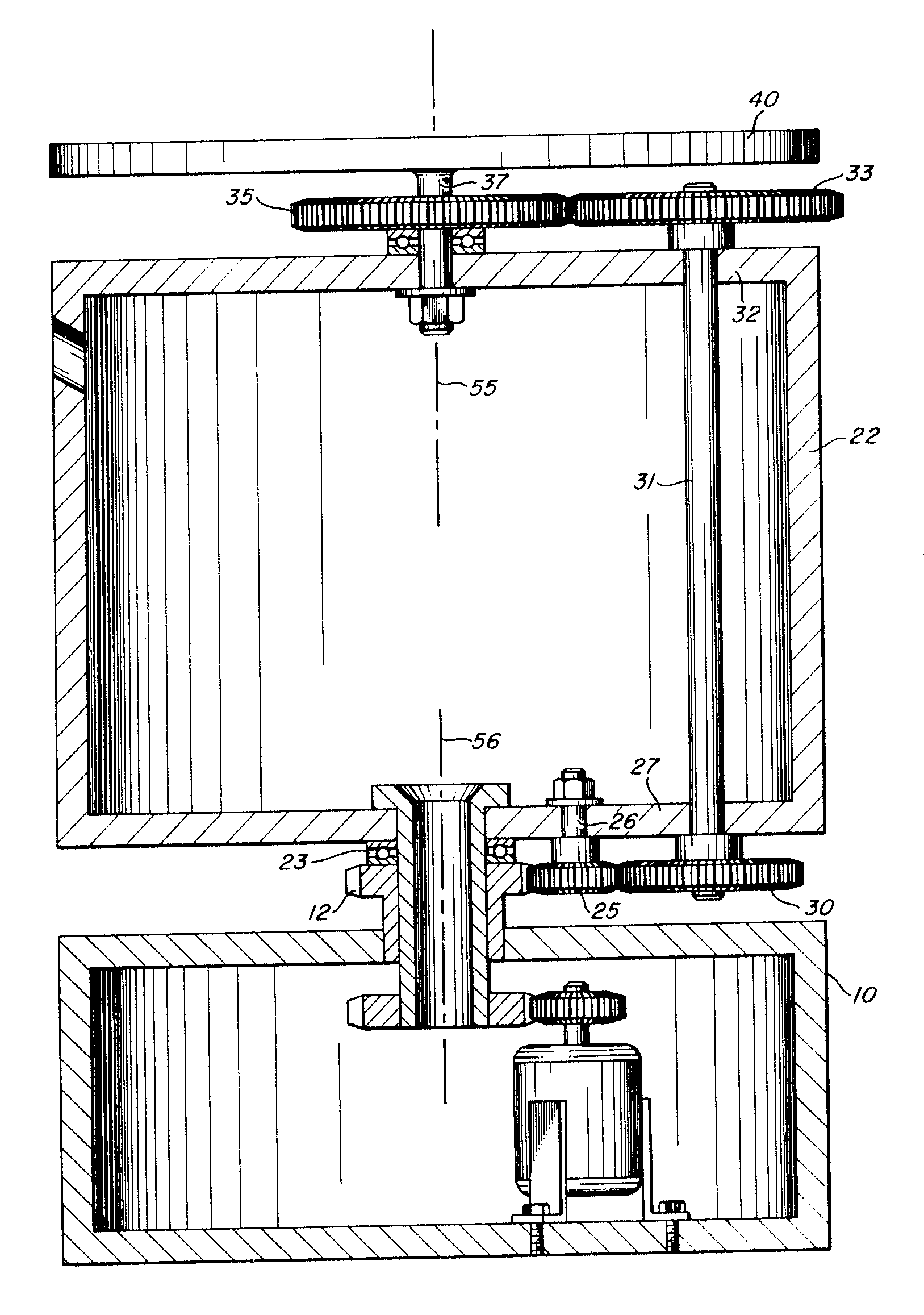 The rotating support 22 may be separated from the stationary surface 10 and ring gear 12 by a bearing 23. It may thus be seen that energization of the electric motor 13 results in the rotation of the rotating support 22 through the expediency of the drive gear 15 and ring gear 16. The rotating support 22 supports an idler gear 25 mounted on a shaft 26 journaled in the bottom wall 27 of the rotating support 22. The idler gear 25 is in driving engagement with the ring gear 12 and will therefore rotate as it revolves about the ring gear 12. A lower transfer gear 30 is in driving engagement with the idler gear 25 and is mounted on a transfer shaft 31 journaled in the lower wall 27 and the upper wall 32 of the rotating support 22. The opposite end of the transfer shaft 31 is connected to an upper transfer gear 33 which is positioned in driving engagement with a platform drive gear 35. The platform drive gear 35 is mounted on a shaft 37 journaled in the top wall 32 of the rotating support 22; the shaft 37 extends above the platform drive gear and acts as a support for a rotating platform 40. The gear ratios of the fixed ring gear 12, idler gear 25, transfer gears 30 and 33, and the platform drive gear 35 are chosen to provide a relative rotational velocities of the rotating platform 40 and the rotating support 22 of two-to-one.