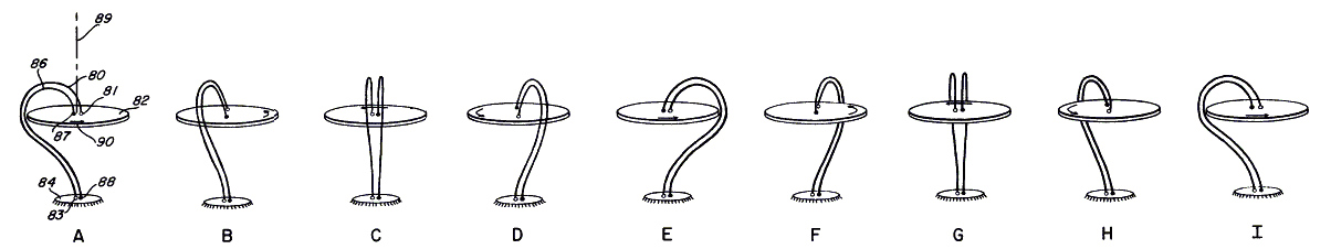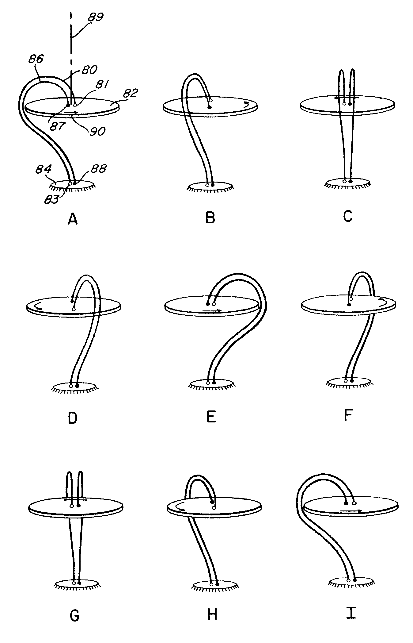 FIGS. 3A – 3I are schematic diagrams of a rotating platform showing successive positions of electrical conductors connected thereto useful for explaining the concept of the present invention.