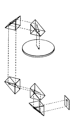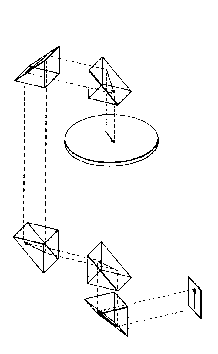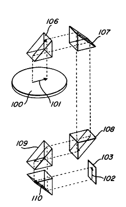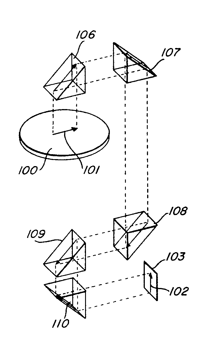 The present invention may also be described, for purposes of understanding the concept, in terms of its applicability to an optical system. It may be understood that while optical systems are concerned with visible wave lengths, we are still concerned with electromagnetic radiation (although of a much higher frequency than heretofore discussed). Even though both the electromagnetic embodiments and the optical embodiments are concerned with electromagnetic energy, the embodiments for practicing the invention will take substantially different forms in view of the behavioral characteristics of the energy in transit. FIGS. 4 – 7 schematically illustrate the utilization of apparatus constructed in accordance with the teachings of this invention for use with optical frequencies. In FIG, 4, a rotating platform 100 is shown having an object 101 mounted thereon which is to continuously be observed while it is being rotated with the platform 100. To facilitate this continuous observation, a stationary and continuous image 102 may be formed on a stationary surface 103 simply by providing an optical transmission path having light receiving and redirecting means such as prisms 106 – 110 positioned in a manner equivalent to the electrical conductors of FIGS. 1 – 3.