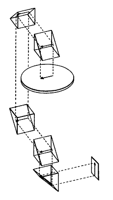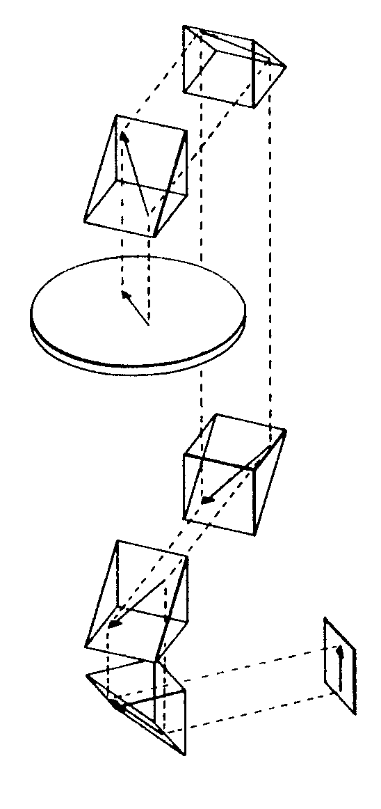 FIG. 5 illustrates the apparatus of FIG. 4 after the platform 100 has been rotated 90°. It may be seen from this schematic illustration that the image 102 formed on the stationary surface 103 remains in an identical orientation to the image previously formed in FIG. 4. Similarly, FIGS. 6 and 7 demonstrate the generation of an image 102 on the stationary surface 103 even though the object 101 has been rotated with the platform 100 through 180° and 270° respectively.