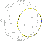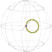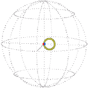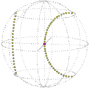 In the particular moving and untangling of the elastic already described, the motion is “planar,” that is, the axis-angle path lies in a plane and the Euler parameter path lies in an ordinary sphere. If we arbitrarily assign the three non-zero Euler parameters to three axes of ordinary space we obtain the following path motion. (In the pictures below, the reference point (1, 0, 0, 0) → (1, 0, 0) is the extreme right point of the sphere.)