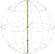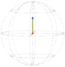 This axis-angle can be represented by a vector: an arrow in the line of the axis, with its length equal to the rotation angle (using some arbitrary factor to convert angle units into distance units, say 1 for 1 radian). [1]  The vector is unique if we agree to ignore the difference between two vectors in opposite directions when the angle of rotation (the length of the vector) is 180°,  because rotating the sphere through 180° about either vector gives the same final position. [2]