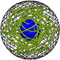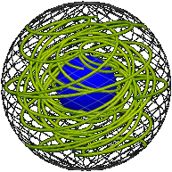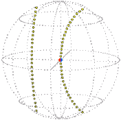The position of the stationary rim is represented by  ± (1, 0, 0, 0)  in Euler parameters. A position of the elastic is represented by a path starting from this point. If one of the last three of the four coordinates is zero all along the path, you can take a cross-section of the sphere in four dimensions to obtain an ordinary sphere in three in three dimensions – a “great sphere” analogous to a great circle – that contains the entire path. (In the axis-angle representation the same path will lie in a plane, as described in the previous section.)