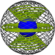 Here is the core turning about exactly once about the vertical axis, the elastic passively following, as represented in real space and position space (snapshot each quarter turn). Imagine a sphere shrinking as it turns, each circle on it tracing out a rope: