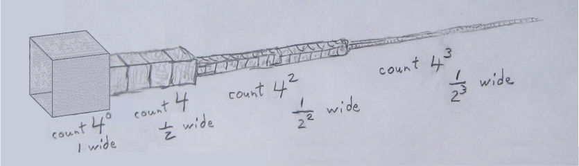 ** By lateral surface we mean the surface parallel to the xy or xz planes and neglecting surface perpendicular to the x-axis. Even were we to include the latter it wouldn’t matter because it turns out the former is infinite. However it is easy to figure out what it is. Imagine looking at the trumpet along the x axis from +∞. You would see only the area perpendicular to the x axis and its total is the same as the facing side of the first cube of width 1, the sillouette of the trumpet. Thus the non-lateral surface area is 1.